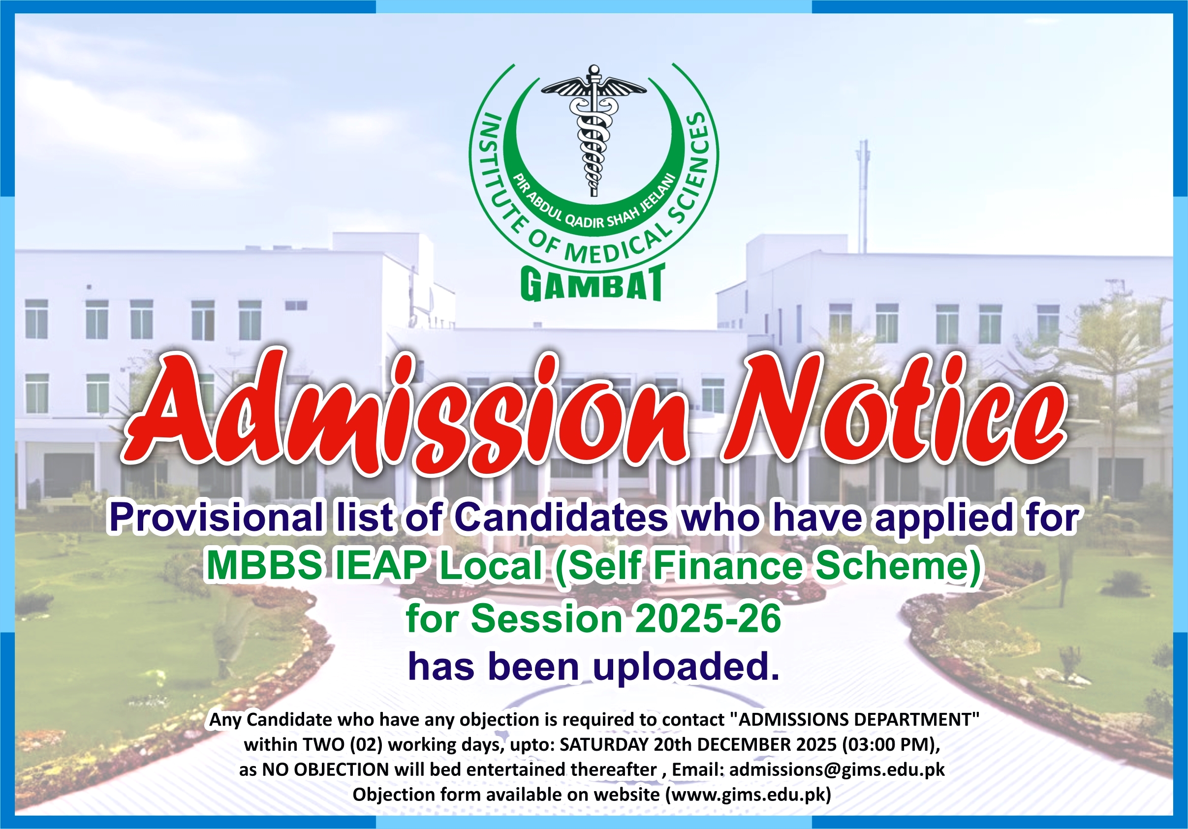 PAQSJIMS is a teaching hospital, It has been rated a first-rate teaching hospital at the level of a medical center by the Department of Health. In addition to its three missions as a medical center (providing medical services, teaching and training, and engaging in research and development, PAQSJIMS normally provides the best medical care available, during wartime its main function is to mobilize and integrate medical resources in different areas. Gambat one of the eight Talukas of Khairpur District, centrally located in Sindh having dual carriage highway road and laying on main railway line and one on the left bank of river Indus with 300,000 people.